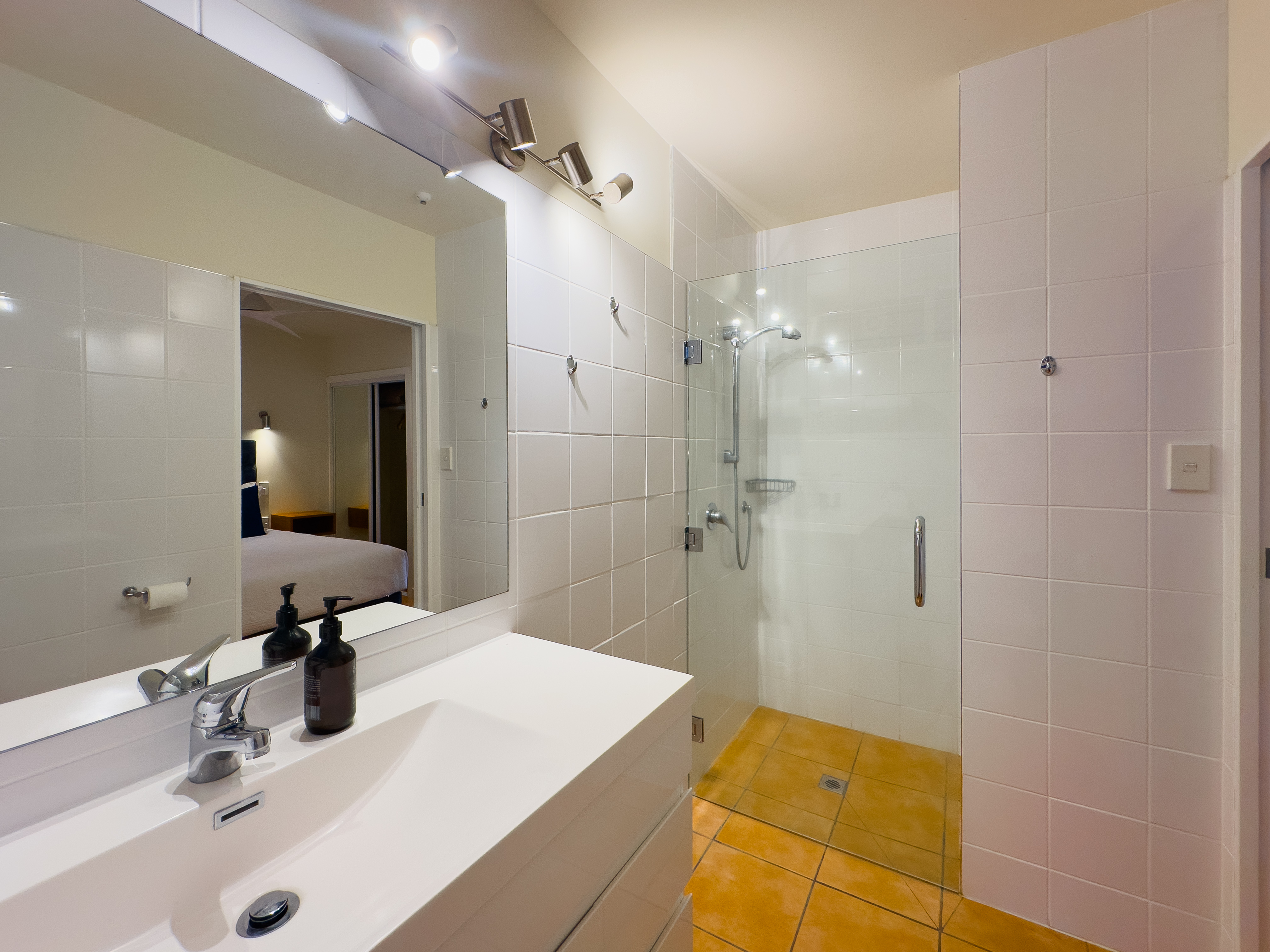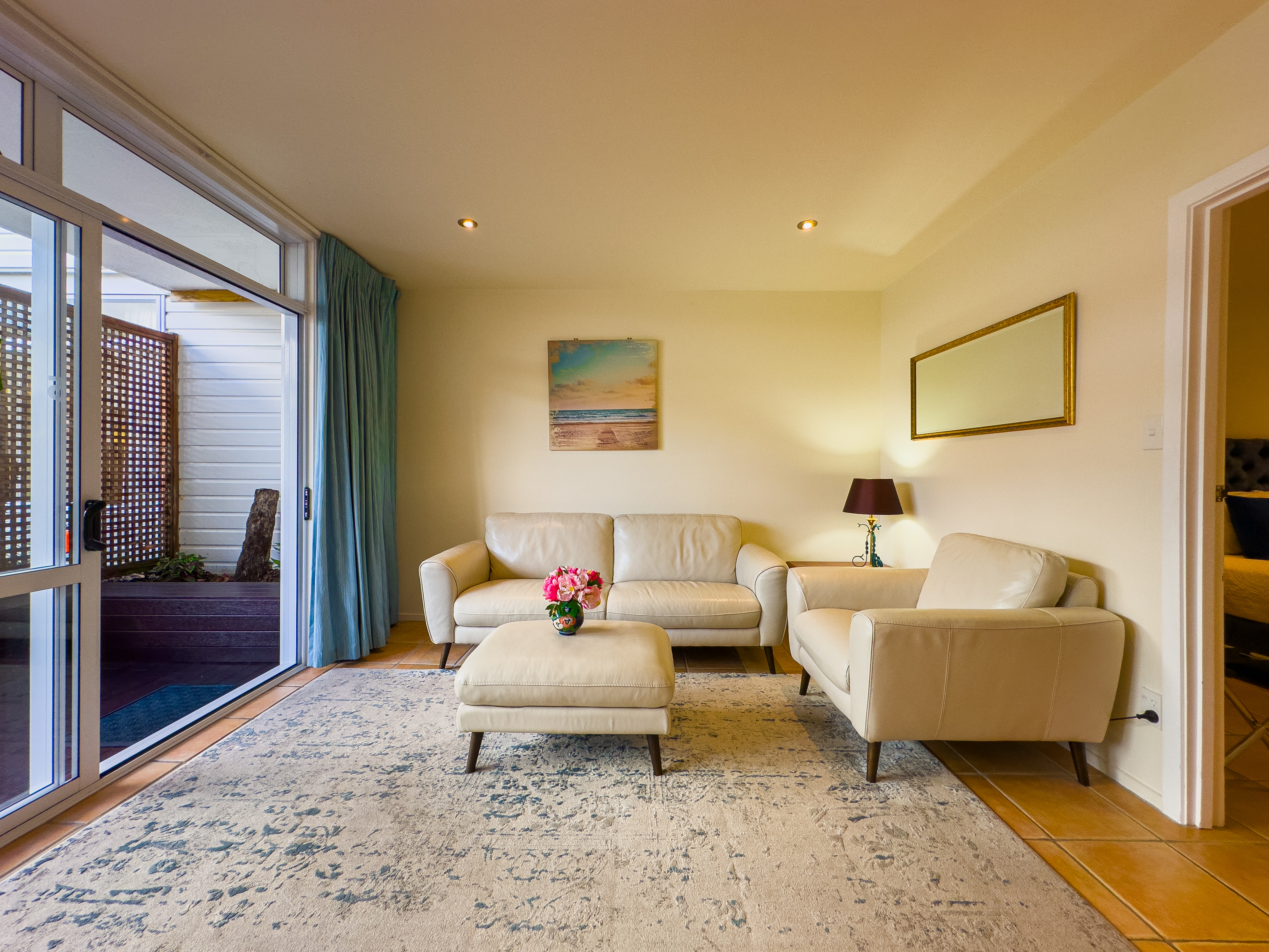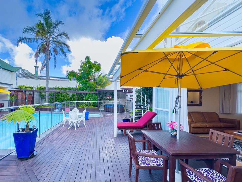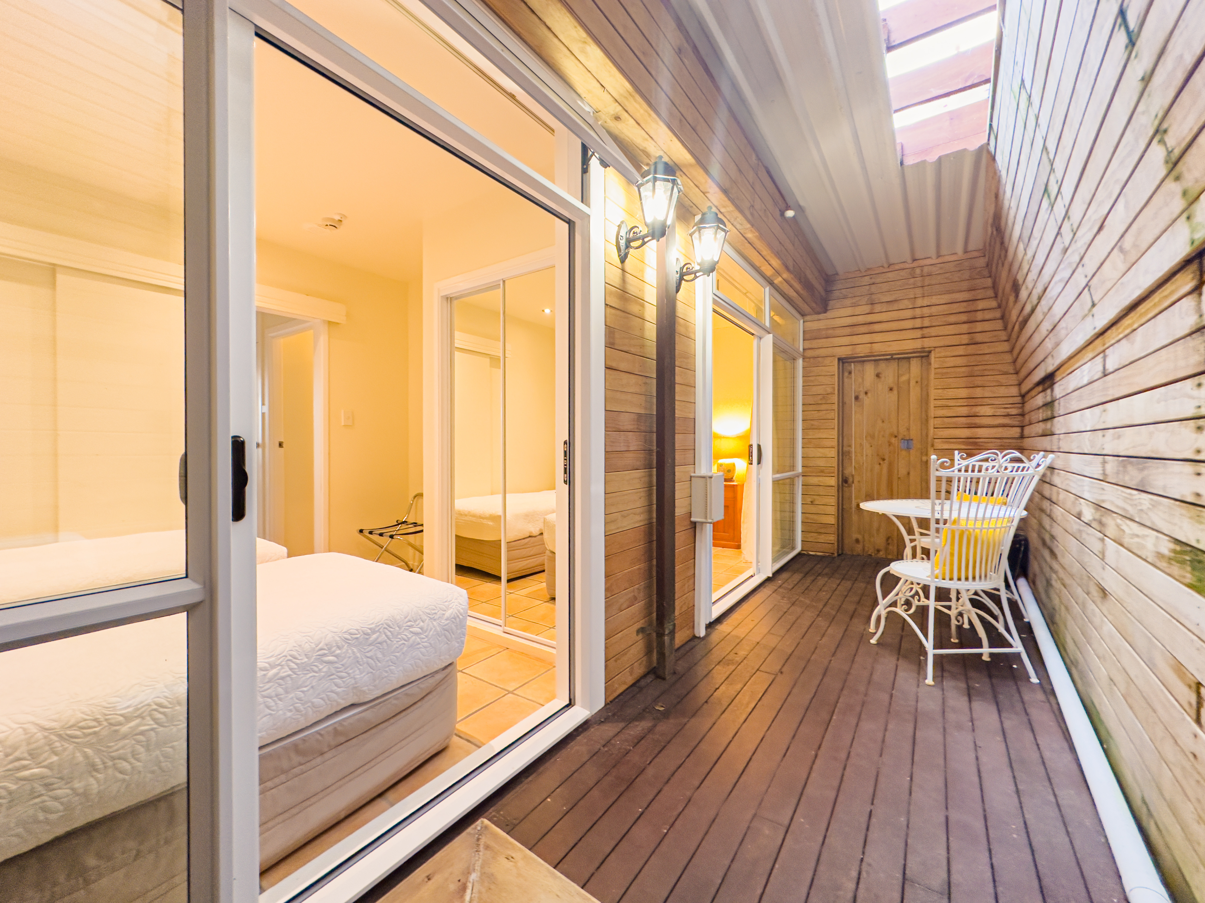 Situated slightly away from the pool and features private front and rear outdoor areas.