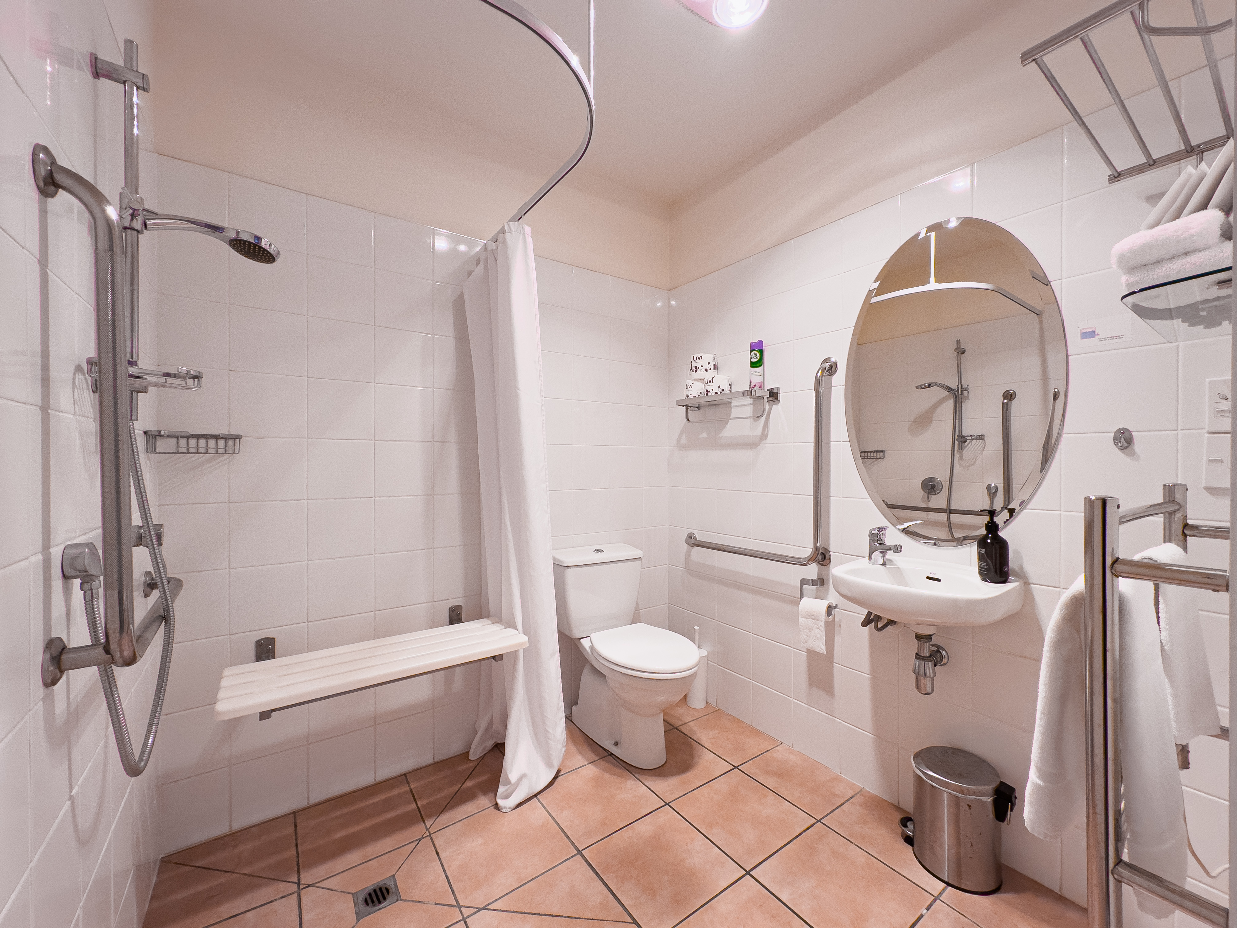 A poolside unit with rear private deck and featuring a wheelchair accessible bathroom.